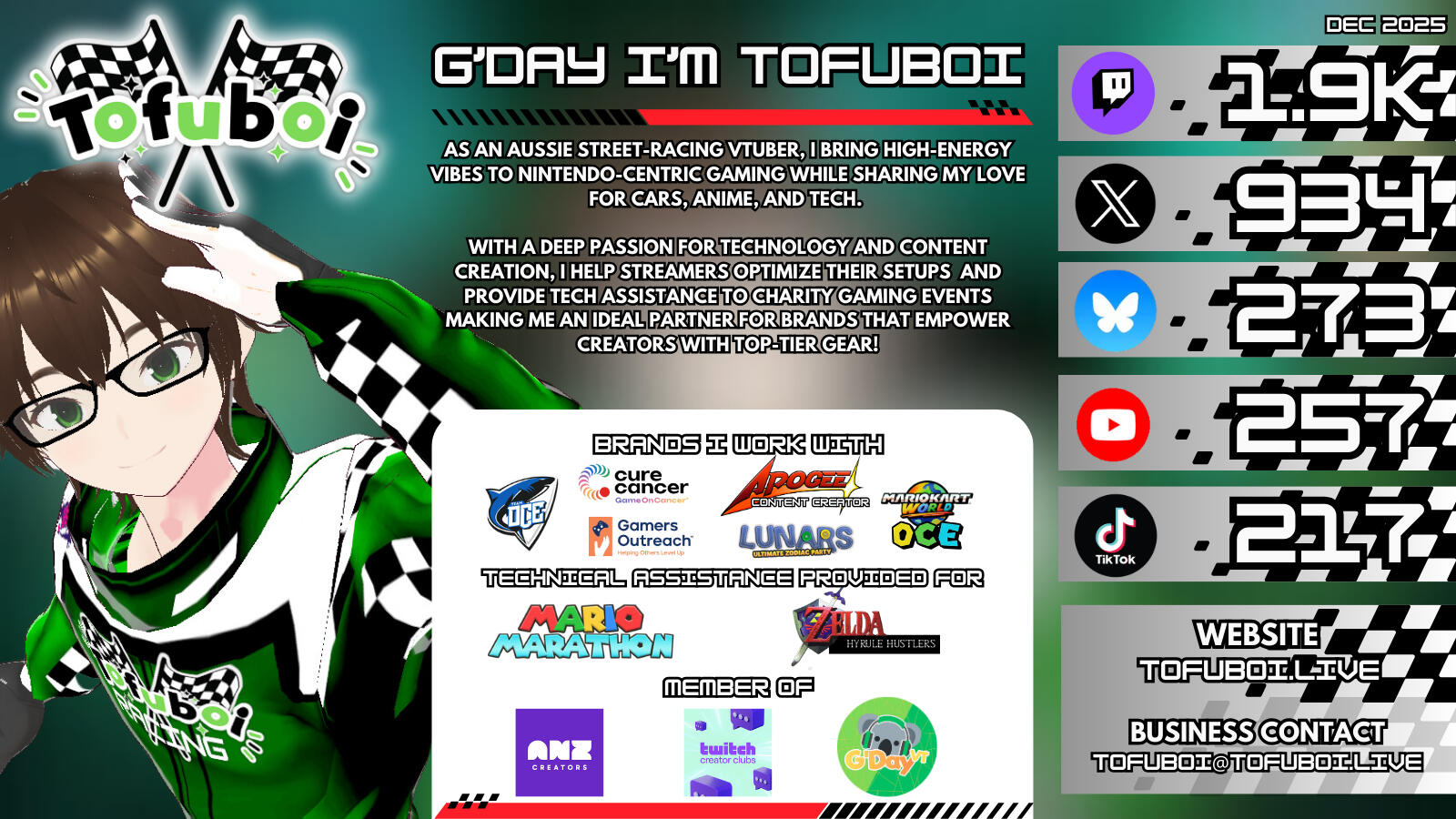 I'm just a little ol' Street Racing VTuber! I play variety (but mostly Nintendo-centric) games and hark from the great southern land of Australia! I aim to bring a friendly and chill time with my love for cars, anime, computer games and more. :D